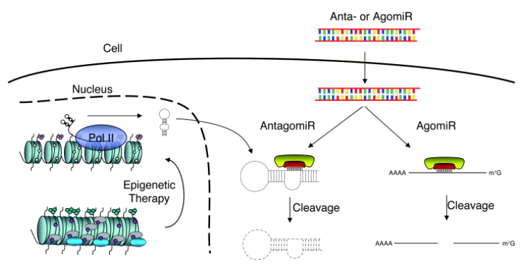 越来越多的研究显示,miRNA的表达情况会对包括肺癌,乳腺癌,脑瘤以及白血病等癌症的发生发展产生明显的影响。由于癌症是一种涉及到多个蛋白编码基因,多条信号通路的基因病变,传统的针对单一基因的基因治疗效果有限。而miRNA拥有多个靶点,可以同时影响不同信号通路的特性可以使其成为调控肿瘤相关基因的枢纽。因此,以miRNA为靶点的Agomir/Antagomir分子,具备一般药物所不具备的强大效力,有非常高的治疗潜力。例如,在小鼠模型的研究中,肝细胞中含量丰富的miR-122可以被Antagomir特异性沉默导致胆固醇水平下降。这项研究提出了癌症治疗的一种新思路:在致癌miRNA到达目标mRNA之前将其沉默。与之对应的,也可以针对致癌miRNA进行相应的临床治疗。此外,在对胰腺细胞系的一项研究中,科学家证明了以靶向致癌的Gli-1 mRNA的3'-UTR为目标设计合成的miRNA Agomir可以沉默靶mRNA,抑制细胞增殖。